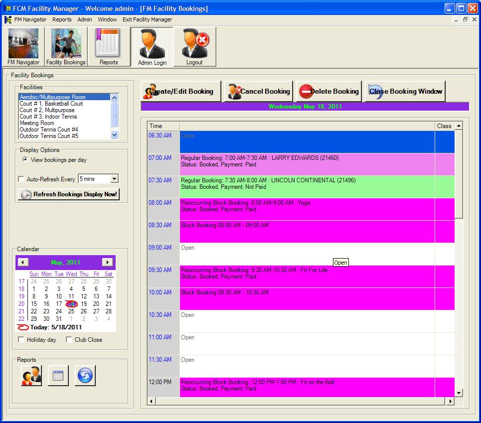 The FCM Facility Manager performs booking functions for courts, fitness classes, fitness training sessions, sun tanning, and more. You can also keep track of locker, lock and tote box rentals. You may also schedule classes and keep track of class attendance, and send emails to class participants in the case of changes or if you need to provide them with more information before coming to the class.